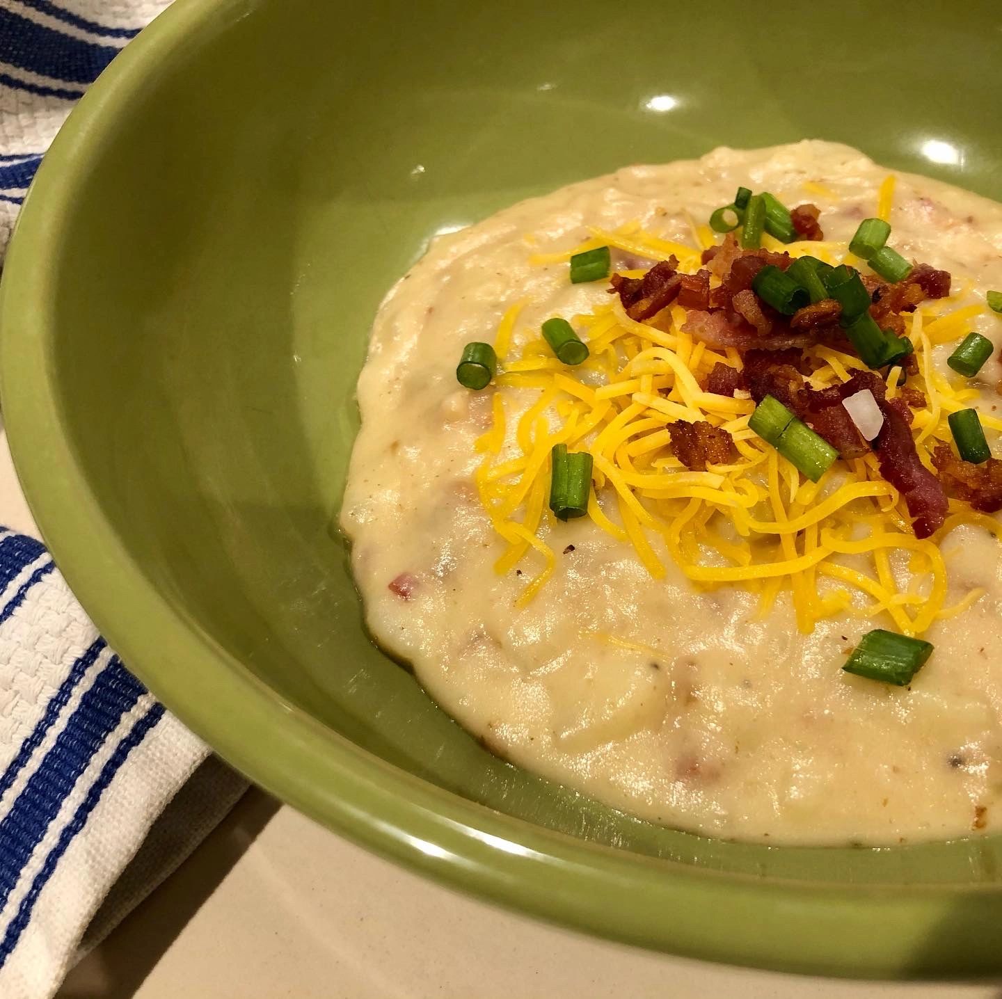 Ladle soup into bowls. Top servings with bacon, green scallion pieces, and yellow Cheddar.