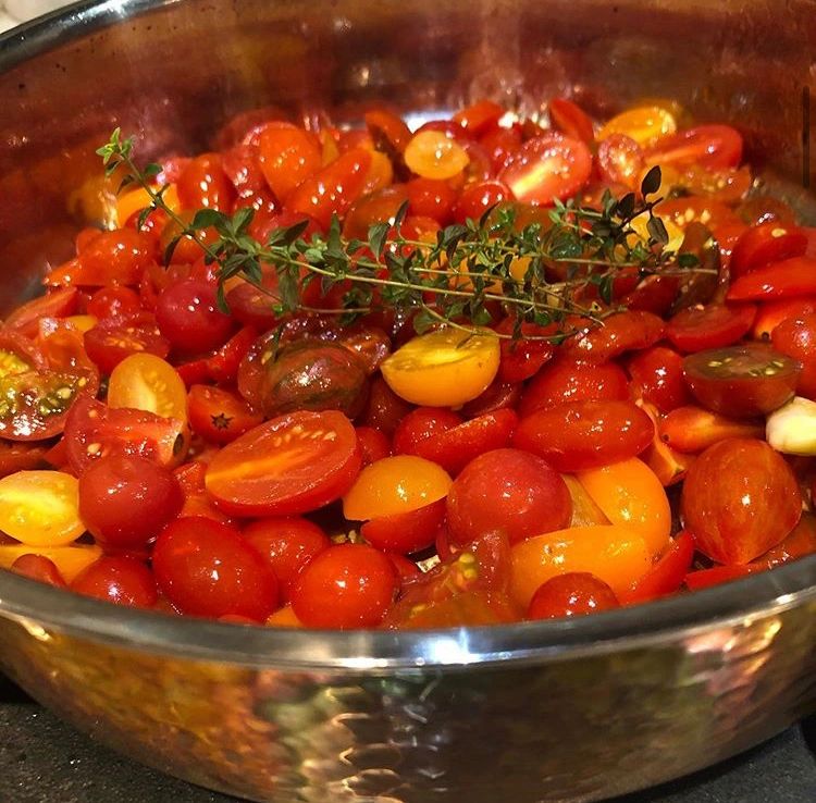 Heat 4 tbsp of olive oil in a sauté pan on medium heat, add garlic and cook for 30 seconds to 1 min until fragrant. Add cherry tomatoes and let cook on medium for a couple of minutes to release juices. Turn pan down to a simmer, add fresh thyme leaves and let simmer for at least 15 mins to really get those tomatoes juicy! If your tomatoes aren't very juicy, you can add your can of Italian tomatoes (with the juices). You will want to find authentic cherry tomatoes because while the US has more acidic tomatoes, Italian tomatoes are very sweet. You are looking for that sweetness and brightness to shine.